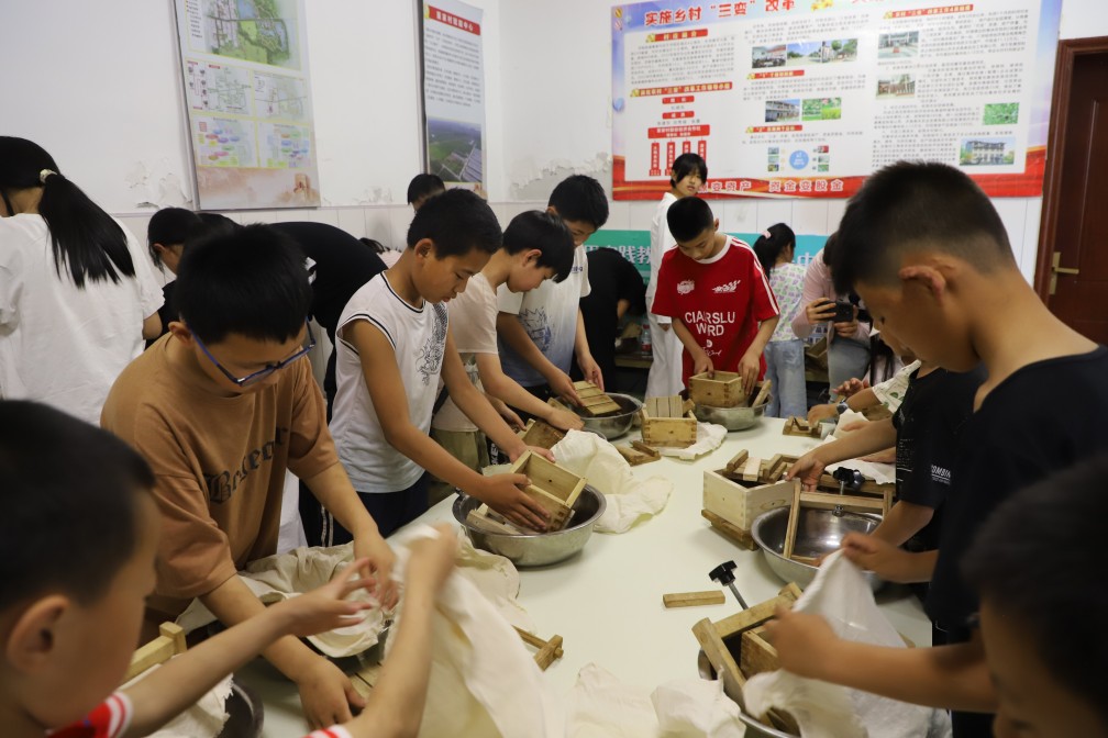 在豆工坊追溯百年匠心傳承,體驗(yàn)非遺石磨工藝。孩子們推動(dòng)磨把,乳白的豆?jié){緩緩滲出,空氣中漸漸彌漫出清新的豆香。孩子們小心翼翼地將豆花倒入模具,輕輕壓實(shí)。等待脫模時(shí),每個(gè)孩子都充滿期待。當(dāng)孩子們打開(kāi)模具,看著自己親手制作的豆腐,臉上洋溢著自豪的笑容。