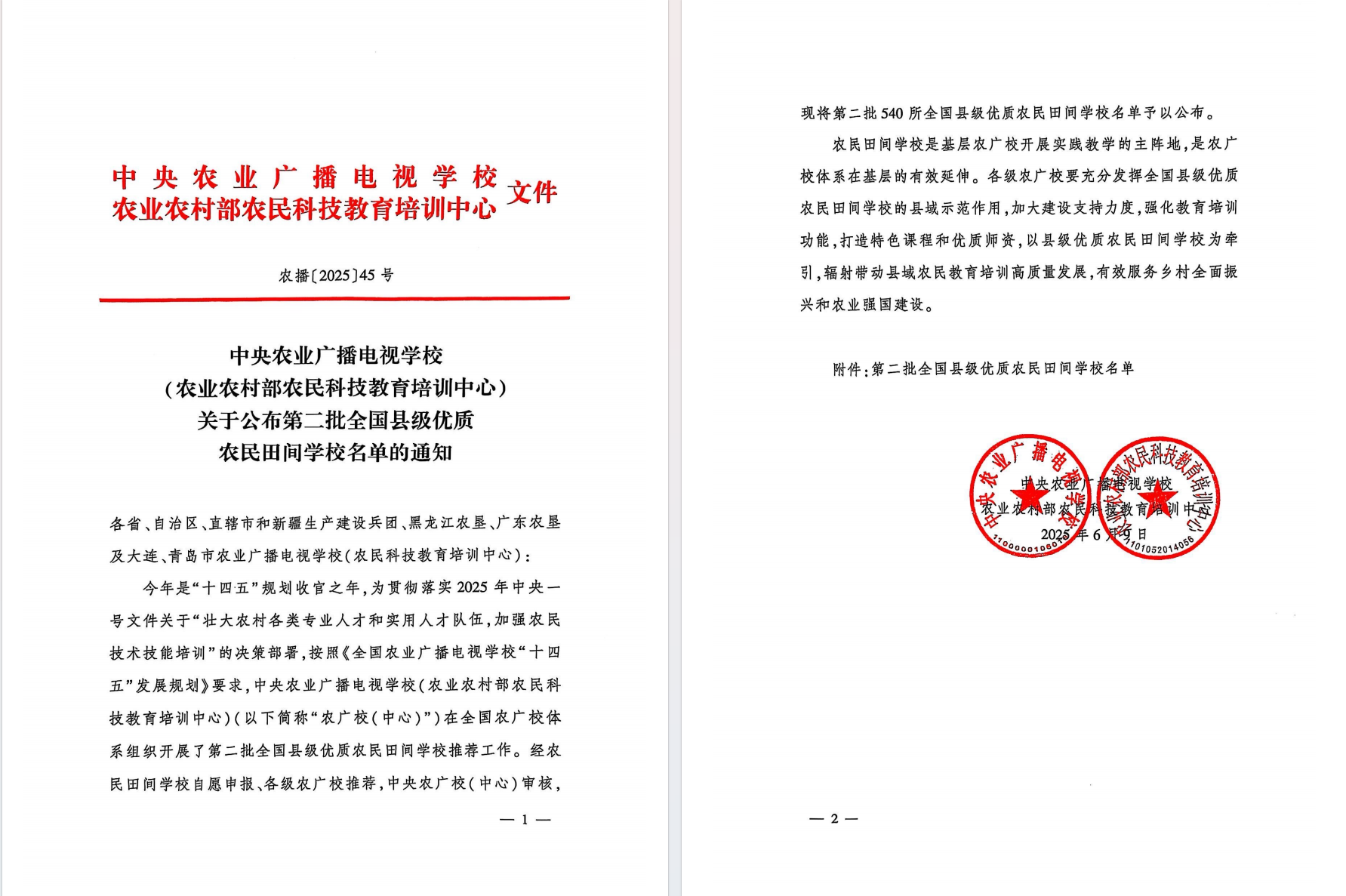 2025年6月9日,中央農(nóng)業(yè)廣播電視學(xué)校(農(nóng)業(yè)農(nóng)村部農(nóng)民科技教育培訓(xùn)中心)公布了“第二批全國(guó)縣級(jí)優(yōu)質(zhì)農(nóng)民田間學(xué)校名單”。濟(jì)南易豐農(nóng)業(yè)科技有限公司農(nóng)民田間學(xué)校,榮耀上榜,榮獲國(guó)家級(jí)殊榮!