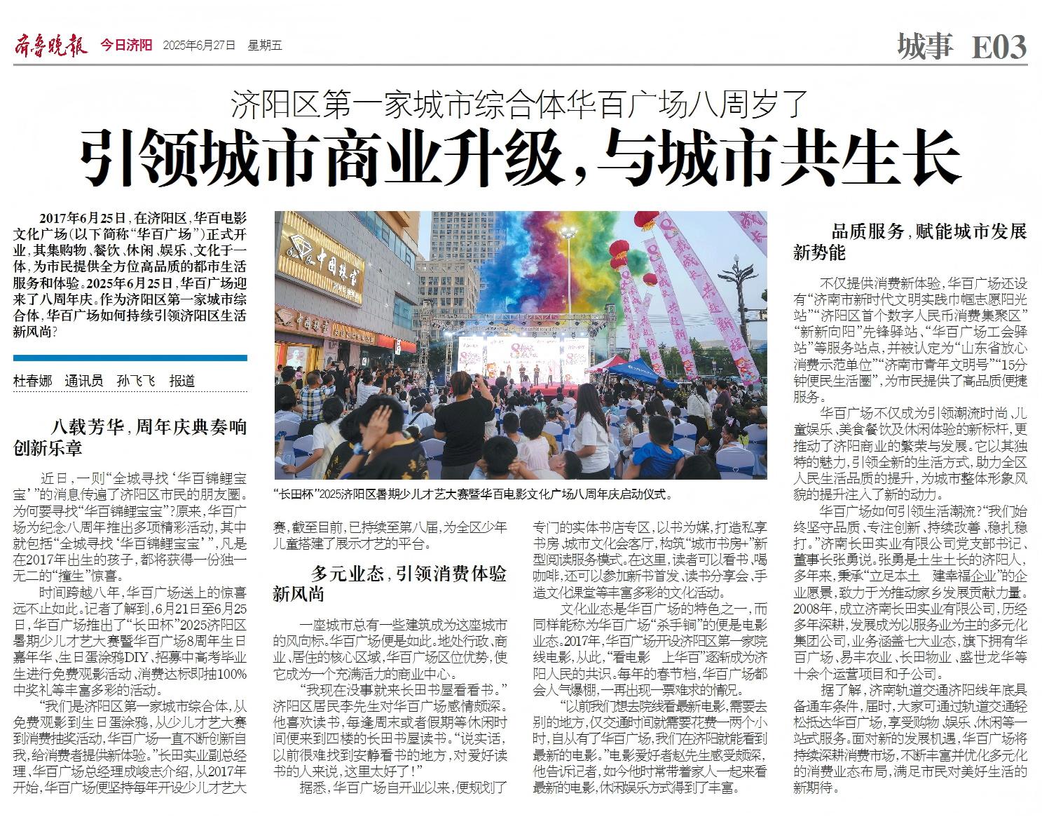 2017年6月25日,在濟(jì)陽區(qū),華百電影文化廣場(以下簡稱“華百廣場”)正式開業(yè),其集購物、餐飲、休閑、娛樂、文化于一體,為市民提供全方位高品質(zhì)的都市生活服務(wù)和體驗(yàn)。2025年6月25日,華百廣場迎來了八周年慶。作為濟(jì)陽區(qū)第一家城市綜合體,華百廣場如何持續(xù)引領(lǐng)濟(jì)陽區(qū)生活新風(fēng)尚?